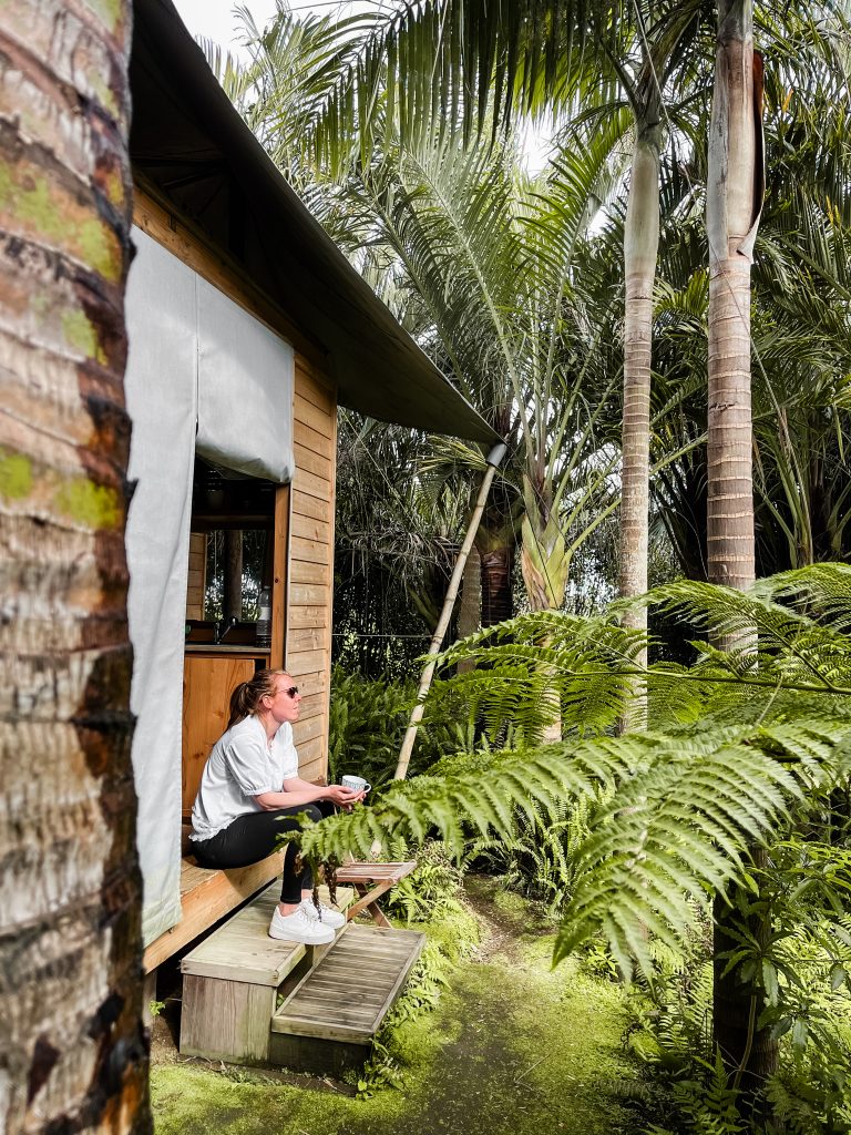 Wir übernachteten hier in einem der „Luxuszelthäuser“. Das ist eigentlich ein Holzhaus, aber einige Wände und alle Fenster bestehen aus Zeltplanen und „Zeltfenstern“. Das Haus besteht größtenteils aus Fenstern. Sogar von der Toilette aus hast du auf zwei Seiten ein großes Fenster, sodass du „auf die Toilette mit Aussicht“ kannst. 😜 Auch die Aussicht rund um das Haus ist wunderschön. Du bist von Natur und Palmen umgeben!